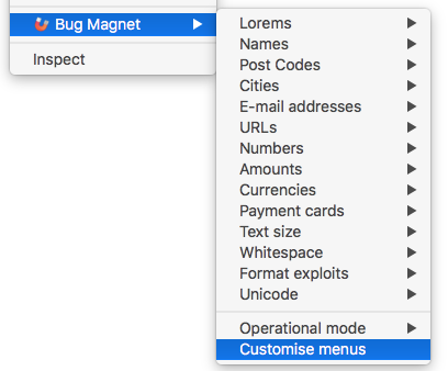 The easiest way to customise BugMagnet is to add your own config files to it. Just click on the Customise Menus option in the context menu, then select additional files to load. You can load local files, load a configuration published on a web URL, or paste the configuration directly from the clipboard.